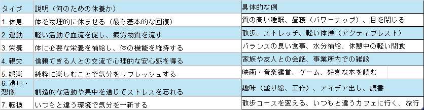①休息タイプ 体を物理的に休ませる(最も基本的な回復方法)