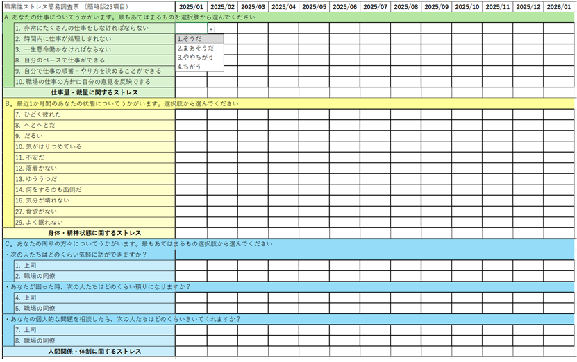 これらの項目は、厚労省の職業性ストレス簡易調査票をもとにしたものであり、内容に一定の妥当性があります。